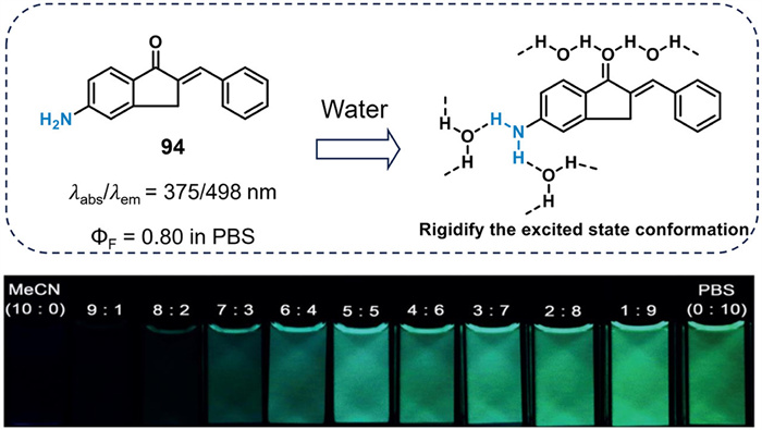 Utilizing hydrogen bond networks between dyes and polar solvents can enhance dye brightness in certain situations (Fig. 15) [91]. For example, dye 94 exhibited fluorescence quantum yields of 0.80 in PBS, 0.53 in EtOH, 0.12 in MeCN, and 0.02 in CH2Cl2, demonstrating 113-fold brighter emission in PBS compared to CH2Cl2. Furthermore, dye 94 showed significant fluorescence turn-on as the PBS ratio increased (Fig. 15). According to DFT studies, hydrogen bond networks can restrict intramolecular rotation, minimizing non-radiative decay and thereby increasing quantum yields in aqueous environments. This phenomenon is known as HIEE.