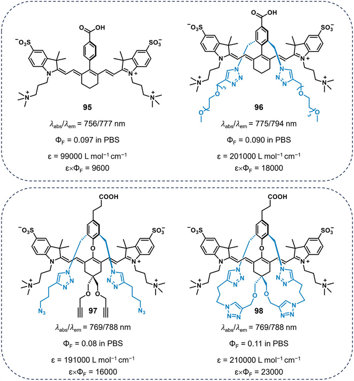 Heptamethine cyanine dyes have large hydrophobic surface areas, which promote aggregation in aqueous environments and thus significantly reduce brightness. For example, dye 95 (ɛ×ΦF = 9600 in PBS) exhibits moderate brightness due to its rigid hydrophobic core (Fig. 16). To improve the performance of dye 95 in aqueous environments, Smith et al. designed a sterically shielded dye 96 (ɛ×ΦF = 18, 000) with two shielding arms, which enhance both photostability and brightness [92]. Subsequently, they synthesized dye 98 with constrained flanking straps, which exhibited a quantum yield of 0.11 in PBS, higher than that of the unstrapped dye 97 (ΦF = 0.081) [93]. The results indicate that the restricted flanking straps in dye 98 are more effective at inhibiting nonradiative decay of the excited state.