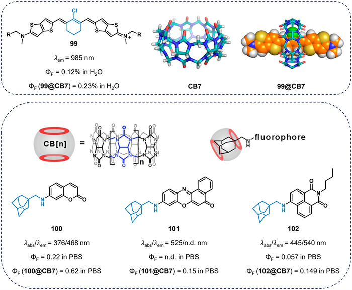 Macrocyclic structures can serve as molecular containers for fluorescent dyes, facilitating the formation of host-guest complexes. The geometric confinement of fluorophores within the host can modify their photophysical characteristics by restricting intramolecular rotation and thus inhibiting nonradiative decay processes. Dyes enclosed in a rigid, complementary molecular container can reduce aggregation and protect against external quenchers, resulting in increased brightness in aqueous conditions [94]. In a recent study, Smith et al. employed dye 99 encapsulated in cucurbit[7]uril (CB7) to increase the quantum yield from 0.12% to 0.23% in water (Fig. 17) [95]. Ge and co-workers also reported host–guest complexation between an auxochrome and CB7 to enhance the fluorescence quantum yield of dyes in water [96]. For example, the quantum yields of complexes 100@CB7 (ΦF = 0.62), 101@CB7 (ΦF = 0.15), and 102@CB7 (ΦF = 0.149) were significantly higher than those of the free dyes 100 (ΦF = 0.22), 101 (ΦF = not detected (n.d.)), and 102 (ΦF = 0.057), respectively.