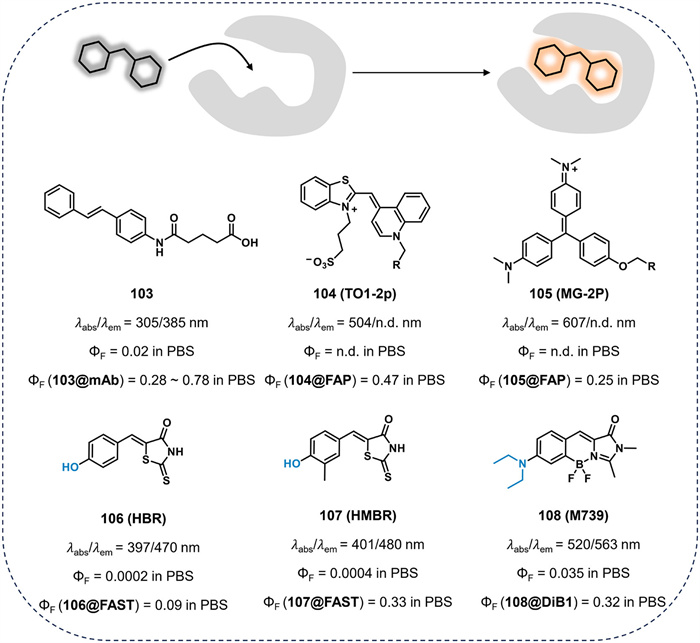 The protein also provided a confined environment for the dye, inhibiting intramolecular mobility and resulting in intense fluorescence (Fig. 18) [3]. GFP is a well-known example of a fluorophore enclosed within a protein that emits light when excited at specific wavelengths. Another example is stilbene derivative 103 (ΦF = 0.02), which showed very low fluorescence in solution due to efficient nonradiative decay through cis-trans isomerization [97]. In striking contrast, the antibody-stilbene complex 103@mAb display higher fluorescence quantum yield (ΦF = 0.28–0.78) in PBS. In 2008, Waggoner et al. developed fluorogen-activating proteins (FAPs), which enhance the fluorescence emission performance of fluorophores [98]. For instance, compounds 104 (TO1-2p) and 105 (MG-2p) exhibited no fluorescence in PBS. Upon binding to FAPs, the dye complexes 104@FAP (ΦF = 0.47) and 105@FAP (ΦF = 0.25) displayed strong fluorescence. Gautier et al. also reported fluorescence-activating and absorption-shifting tags (FASTs), which lock the fluorophore into a planar conformation, resulting in high fluorescence [99, 100]. The rhodanine derivatives 106 (4-hydroxybenzylidene-rhodanine (HBR), ΦF = 0.0002) and 107 (4-hydroxy-3-methylbenzylidene-rhodanine (HMBR), ΦF = 0.0004) showed low fluorescence in solution, while dye complexes 106@FAST (ΦF = 0.09) and 107@FAST (ΦF = 0.33) exhibited higher fluorescence. In 2017, Mishin et al. reported a protein capable of binding dye 108 (M739, ΦF = 0.035), which shows a remarkable enhancement in fluorescence upon binding to the protein (108@DiB1, ΦF = 0.32) [101].
