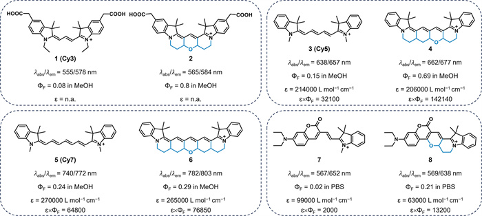 Fluorophores with significant conformational flexibility exhibit non-radiative energy loss during excitation, resulting in poor quantum yields. Scaffold rigidification effectively reduces non-radiative decay and consequently increases quantum yield, as demonstrated by cyanine scaffolds, which are prone to photoinduced excited-state trans-to-cis polyene rotations (Fig. 2). For instance, the rigidification of cyanine 1 (Cy3) results in a 10-fold enhancement in quantum yield for 2 [32]. The quantum yield increased from 0.08 with 1 to 0.8 with 2 in MeOH. In 2017, Schnermann et al. developed a pentamethine indocyanine 4 with structural rigidity [33]. In MeOH, compound 4 displayed a quantum yield of 0.69, which is 4.6 times higher than that of the conventional pentamethine cyanine 3 (Cy3, ΦF = 0.15). Furthermore, the fluorescence quantum yield of 4 is largely unaffected by solvent viscosity. They further expanded the strategy to the heptamethine cyanine scaffold [34]. The modified compound 6 showed a slight increase in quantum yield (from 0.24 to 0.29) compared to the conventional fluorophore 5 (Cy7) in MeOH. Recently, Guo et al. developed a series of conformationally restricted hemicyanines by incorporating a bicyclic ring system into the skeleton of conventional coumarin hemicyanines [35]. Among these dyes, 8 exhibited a much higher fluorescence quantum yield (ΦF = 0.21) in phosphate buffered saline (PBS) compared to the unmodified dye 7 (ΦF = 0.02). These results suggest that conformational restriction is an effective strategy for inhibiting non-radiative energy loss through photoisomerization.