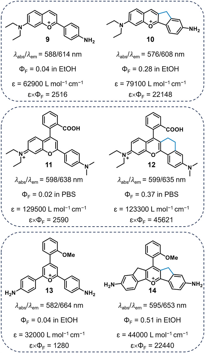 Furthermore, energy is dissipated from the excited state through the rotation of aromatic substituents. Anthocyanidin is a natural flower pigment with a low quantum yield. To enhance its quantum yield, our group fixed the rotational aryl rings and developed novel AC-Fluor dyes [36]. As illustrated in Fig. 3, anthocyanidin 9 exhibited a quantum yield of 0.04 in EtOH, whereas AC-Fluor 10 demonstrated a 7-fold increase in quantum yield (ΦF = 0.28). In another study [37], compound 11 with flexible structures exhibited a quantum yields of 0.02 in PBS. In contrast, 12 possessed rigid and planar molecular structures, demonstrating a higher fluorescence quantum yield (ΦF = 0.37). 2, 4, 6-Triphenylpyrylium salt 13 has unique photophysical characteristics but is unsuitable for bioimaging due to its low fluorescence (ΦF = 0.04 in EtOH). By restricting the rotation of aryl rings [38], compound 14 exhibited a more than 12-fold increase in quantum yield (ΦF = 0.51) compared to compound 13.
