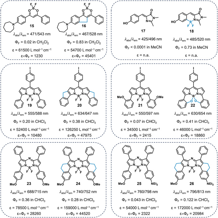 An azepane-substituted boron dye 15 exhibited low quantum yields (ΦF = 0.02) due to free intramolecular bond rotation (Fig. 4) [39]. After introducing a methylene bridge in the structure and restricting the C-C bond rotation, 16 displayed significantly higher quantum yields (ΦF = 0.83). Solntsev's group discovered that the synthesized chromophores of green fluorescent protein (GFP) had dramatically different fluorescence characteristics compared to wild-type GFP (wtGFP). Due to its flexible structure, compound 17 exhibits a low fluorescence quantum yield (ΦF < 10−4) [40]. Therefore, they designed a locked molecule 18, which displayed a quantum yield of 0.73 in acetonitrile, similar to that of wtGFP (ΦF = 0.79). These findings also demonstrate that controlling intramolecular bond rotation could improve dye quantum yields.
