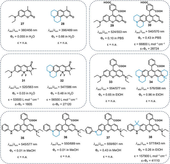 To prevent the formation of the TICT state, cyclic substituents on the nitrogen atom are commonly employed. Chemists inhibited the twisting of the amino group by cyclizing it into a rigid six-membered ring structure. This structural modification impedes the formation of the TICT state, thereby enhancing the quantum yield of the dyes in polar solvents. Bergmark et al. fixed the amino group of coumarin 28 through amino-cyclization, inhibiting its torsion and resulting in an increased quantum yield of 0.66 in water (Fig. 6) [51]. In contrast, the freely twistable N, N-diethylamino-substituted compound 27 displayed a quantum yield of only 0.055 in water. Prendergast et al. employed the same modification method for rhodol dyes [52]. The quantum yield of cyclized rhodol dye 30 in PBS was 0.43, significantly higher than that of conventional compound 29 (ΦF = 0.10). To mitigate the deactivation effects induced by amino group twisting, Yampolsky et al. developed GFP analogue 32 with a rigid cycloalkylamino group [53]. Compared to the freely twistable compound 31 (ΦF = 0.03), compound 32 exhibits a higher quantum yield of 0.48 in water.