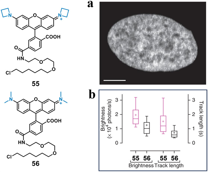 Figure 8.  Molecular structures of 55 and 56 and their corresponding super-resolution imaging performance. (a) Confocal maximum projection image of the nucleus of a HeLa cell incubated with compound 55. (b) Whisker plot comparing brightness and track length of HaloTag-H2B molecules labeled with ligand 55 or 56. Reproduced with permission [58]. Copyright 2015, Springer Nature.