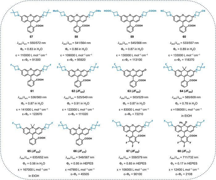 Further functionalization of azetidine groups (e.g., alkyl, methoxy, carboxyl, cyano, fluorine) can be conducted to tune the emission wavelengths and the lactone-zwitterionic equilibrium of rhodamine dyes without affecting the fluorescence quantum yield (such as compounds 5762, Fig. 9) [62]. Subsequently, Lavis et al. developed a series of fluorine-substituted rhodamine dyes covering the entire visible absorption spectrum [62-64], such as 62 (JF525, λem = 549 nm, ΦF = 0.91), 63 (JF503, λem = 529 nm, ΦF = 0.87), 64 (JF585, λem = 609 nm, ΦF = 0.78), 65 (JF635, λem = 652 nm, ΦF = 0.56), 66 (JF479, λem = 517 nm, ΦF = 0.62), 67 (JF559, λem = 579 nm, ΦF = 0.85) and 68 (JF711, λem = 732 nm, ΦF = 0.17). These fluorine-substituted JF dyes maintain excellent brightness and demonstrate a high signal-to-noise ratio in "no wash" cellular imaging experiments. Moreover, they used JF635-Halo to label living brain tissue from Drosophila larvae. As shown in Fig. 10, JF635-Halo displayed consistent labeling throughout the living tissue with low background staining. Lavis and co-workers also applied the JF dyes (such as JF525) for in vivo voltage imaging [65].