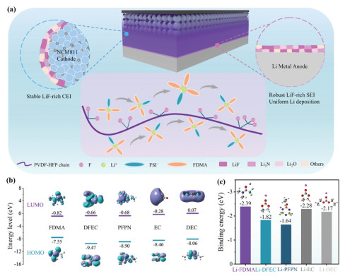 Figure 1.  Design principles of FFP-PE. (a) Schematic illustrations of chemical structures, SEI/CEI structures and performance of FFP-PE. (b) LUMO and HOMO energy levels of the solvents. (c) Binding energies between the solvents and Li+.