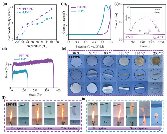 Figure 2.  Properties of FFP-PE. (a) Ionic conductivities of FFP-PE and LE-PE at various temperatures. (b) LSV of FFP-PE and LE-PE. (c) Chronoamperometry of the Li||Li cell with FFP-PE and the corresponding EIS spectra (the inset) before and after polarization. (d) Stress-strain curves of FFP-PE and LE-PE. (e) Dimensional stability tests of FFP-PE, LE-PE and PP separator at different temperatures. Ignition tests of (f) FFP-PE and (g) LE-PE.