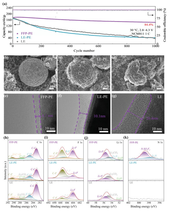 Figure 4.  Cycle performance and structural evolution of Li||NCM811 cells under conventional condition. (a) Cycle performance of Li||NCM811 cells with different electrolytes. SEM of the NCM811 after 1000 cycles in (b) FFP-PE, (c) LE-PE and (d) LE. TEM of NCM811 after 1000 cycles in (e) FFP-PE, (f) LE-PE and (g) LE. XPS spectra of NCM811 after 1000 cycles in different electrolytes: (h) C 1s, (i) F 1s, (j) Li 1s and (k) N 1s spectra.