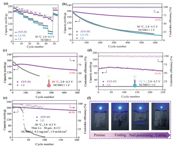 Figure 5.  Performance of Li||NCM811 cells under harsh conditions. (a) Rate performance of Li||NCM811 cells with different electrolytes. Cycle performance of Li||NCM811 cells with different electrolytes cycled at (b) a cut-off voltage of 4.5 V, (c) 50 ℃ and (d) −20 ℃. (e) Cycle performance of high-areal-capacity Li||NCM811 full cells. (f) Photographs of the mechanical abuse tests of Li||NCM811 pouch cell with FFP-PE.