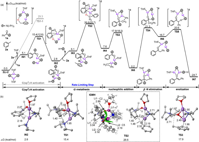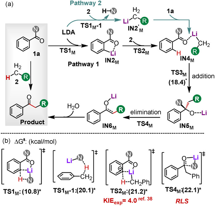 Figure 1  (a) The initial acylation reaction mechanism of Csp3–H bonds promoted by LDA. (b) The key transition states of the acylation reaction between toluene 2a and amide 1a promoted by LDA monomer 1Li. ΔG: the activation Gibbs free energy. *Without considering the 24.9 kcal/mol of zero point corrections. DFT calculations were preformed at the M062X-D3/6–311+G(d, p)//M062X-D3/6–31G(d, p) level of theory.