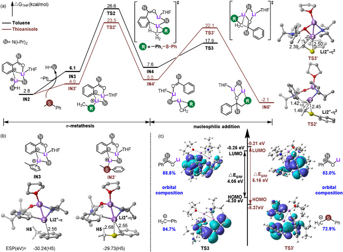 Figure 4  (a) Free energy profile of the σ-metathesis and nucleophilic addition processes in the acylation reactions of 2a and 2a' promoted by LDA dimer (2Li-2). (b) Structural and electrostatic potential comparisons of intermediate IN3 and IN3'. (c) Frontier molecular orbital analysis of TS3 and TS3'in the nucleophilic addition, Egap = ELUMO - EHOMO. The percentages of orbital composition were calculated using the Mulliken method: deprotonated toluene/thioether of HOMO, Li+ activated amide of LUMO.