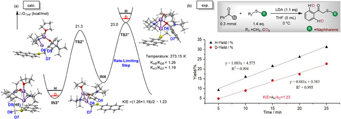 To validate our presumption, pKa values of four additionally designed molecules were calculated in THF solvent containing Csp3–H bonds of 2-(methylthio)naphthalene, 2-methyl-sulfanyl-propane, 1-(methylthio)propane, and anisole (Table S2 in Supporting information). Among these, 2-(methylthio)naphthalene (2a'') exhibited the lowest pKa, prompting further investigations for its reaction mechanism. The higher ESP of the Csp3–H in 2a'' (H5: −29.50 eV), along with a larger Egap in the TS3'' (Egap = 5.24 eV, Fig. S5 in Supporting information), indicates its stronger acidity and weaker nucleophilicity of the conjugate base, which respectively lowers and raises the corresponding reaction barriers. Under our expectation in Fig. 5a, the RLS involving 2a'' substrate shifts from the σ-metathesis of Csp3–H bond activation (TS2'', 21.3 kcal/mol) to the nucleophilic addition process (TS3'', 23.0 kcal/mol) with a calculated KIE value of 1.23 (273 K). Further control experiments confirm that the RLS in the acylation reaction of 2a'' is not directly related to the Csp3–H activation, with an experimentally measured KIE of 1.23 in Fig. 5b, consistent with the calculations. Our findings reflect a new dual Li cooperative model for Csp3–H acylation, which not only enhances the mechanism understanding for activation and transformation of inert bonds to clarify the electronic structures of intermediates and transition states, but also accurately predicts the "anomalous" kinetic phenomena in newly designed substrates.