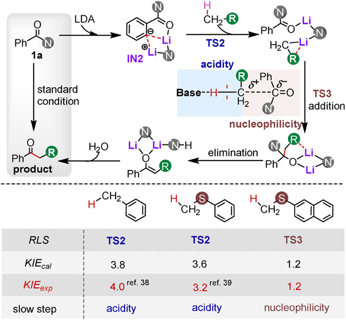 Therefore, the acylation reaction of unactivated Csp3–H bonds with inert amides was used as a case study of reaction mechanisms through theoretical calculations and experimental validation (Scheme 1c). It is crucial to investigate how the relatively weak basic reagents can activate the inert Csp3–H bonds, generating strong basic carbanions, as well as the aggregation effects of alkali metal reagents. The main questions are: (1) How does the weakly basic LDA activate the Csp3–H bonds of weakly acidic toluene/thioanisole? (2) How does LDA aggregation affect the reaction mechanism? Through DFT theoretical calculations and KIE experiments, we propose a LDA dimeric mechanism, revealing a new model of base intermediate for unactivated Csp3–H activation, as well as the synergistic regulatory effect of inert Csp3–H acidity and its conjugate base nucleophilicity. Finally, the anomalous kinetic KIE values for 2-(methylthio)naphthalene were predicted based on the rate limiting step (RLS), which can be validated experimentally.