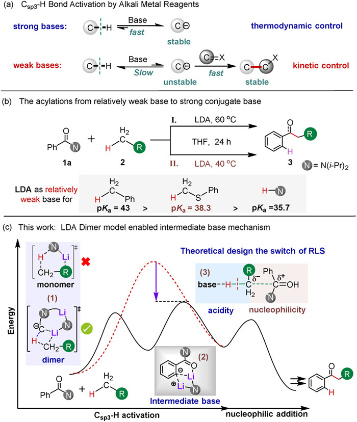 • The Csp3–H bond activation is a key foundation for the synthesis of complex molecules [1-4]. However, unactivated Csp3–H bonds, characterized by a high bond dissociation energy (BDE > 100 kcal/mol) and weak acidity (pKa ≥ 35) [5, 6], present significant challenges for activation. Important strategies for C–H bond activation primarily involve direct deprotonation by very strong Brønsted bases [7, 8], oxidative addition via transition metals [9-11], and hydrogen atom abstraction by radical mechanisms [12, 13]. As Brønsted bases, alkali metal reagents are quite useful in Csp3–H bond functionalization due to their high efficiency and atom economy. The mechanism of Csp3–H activation by these reagents varies depending on their basicity (Scheme 1a): Under strong base conditions, direct activation and functionalization of Csp3–H bonds occur via a thermodynamically stable carbanion intermediate [14-16] Under relatively weaker base conditions, an unstable carbanion intermediate is generated, necessitating subsequent kinetic transformations to overcome the inherent acid-base equilibrium and achieve functionalization [17-19]. Notably, alkali metal reagents exhibit not only anionic basicity but also cationic influences, as studies suggest that the coordination and aggregation states of cations may significantly influence reactivity [20-24]. However, the mechanistic understanding of these roles in synthetic transformations remains underexplored.