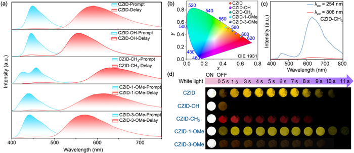 Figure 1.  Fundamentally photophysical properties of CZID and derivatives. (a) Prompt and Delayed photoluminescence spectra of CZID and derivatives (Delay: 1 ms). (b) The CIE 1931 coordinates of delayed photoluminescence spectra for CZID and its derivatives at 410 nm excitation. (c) Delayed photoluminescence spectra of CZID-CH3 under 254 nm and 808 nm excitation. (d) Photographs of the compounds CZID, CZID-OH, CZID-CH3, CZID-1-OMe and CZID-3-OMe in crystalline states under white-light irradiation and at different time intervals after the removal of white-light.