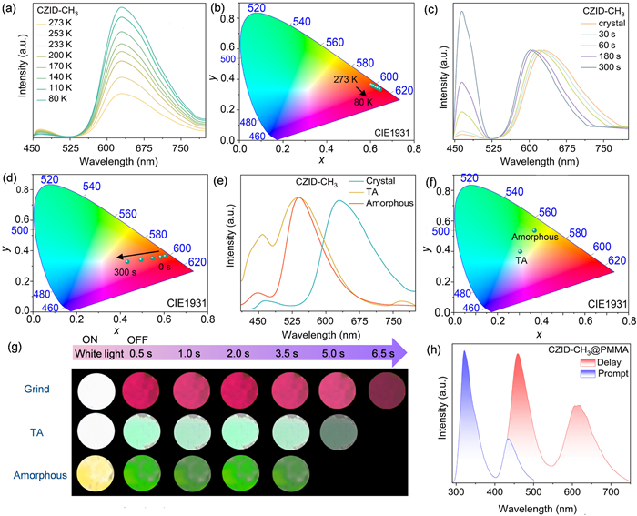 Figure 2  Multilevel stimuli responsiveness of CZID-CH3. (a) Temperature-dependent delayed photoluminescence spectra and (b) the CIE 1931 coordinates of CZID-CH3 at crystal state from 273 K to 80 K (λex = 410 nm, delay: 1 ms). (c) The normalized delayed photoluminescence spectra and (d) the CIE 1931 coordinates of CZID-CH3 in crystalline state and after grinding (λex = 410 nm, delay: 1 ms). (e) The normalized delayed photoluminescence spectra and (f) the CIE 1931 coordinates of CZID-CH3 in crystalline, after TA and amorphous state (λex = 410 nm, delay: 1 ms). (g) Photographs of CZID-CH3 after grinding (300 s), TA and amorphous states under white-light irradiation and at different time intervals after the removal of white-light. (h) Prompt and delayed photoluminescence spectra of doped film CZID-CH3@PMMA (Concentration: 2.5 wt%, λex = 410 nm, delay: 1 ms).