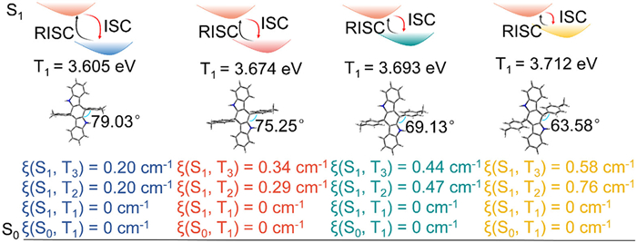 In addition, based on the single crystal structure of the CZID series derivatives, we optimized the ground state and excited state structures at the B3LYP/6–31G(d) level using DFT to explore the influence of terminal groups on the luminescence phenomenon (Fig. S16 in Supporting information). Generally, SOC is one of the important factors affecting the phosphorescence lifetime of organic materials. The stronger the SOC, the higher the inter-system crossing (ISC) efficiency of triplet excitons, which shortens the phosphorescence lifetime. This results in the longest afterglow emission lifetime of CZID. Meanwhile, a lower triplet energy level leads to a longer wavelength of phosphorescence emission, through a simple terminal group regulation strategy, SOC and other factors (such as intramolecular charge transfer, molecular packing) work together to make the lifetime and luminescence color of the series of afterglow materials highly tunable.