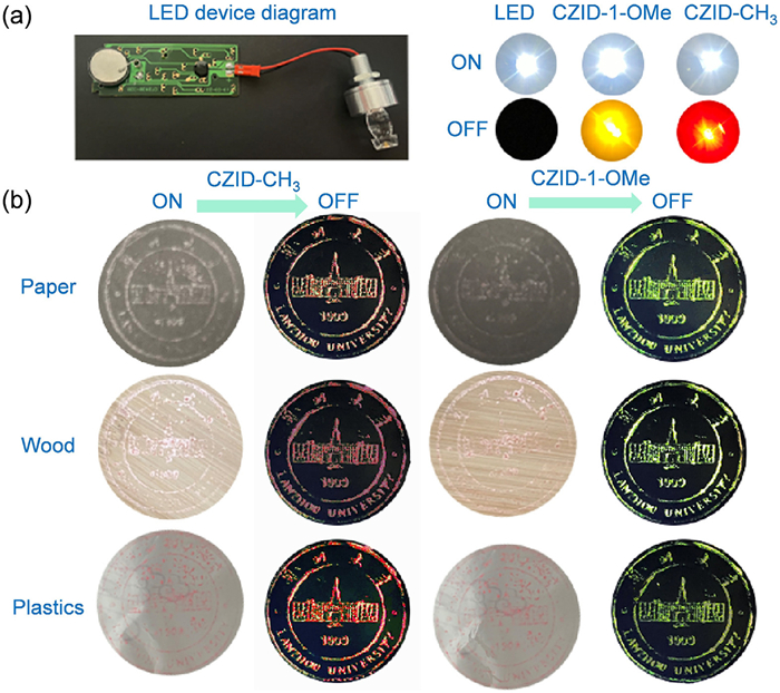 Figure 4  Application of multicolor tunable afterglow materials. (a) Afterglow display device circuit diagram and demonstration of LED afterglow display made of CZID-1-OMe@PMMA and CZID-CH3@PMMA. (b) Application of anti-counterfeit inks prepared by CZID and its derivatives in various situations.
