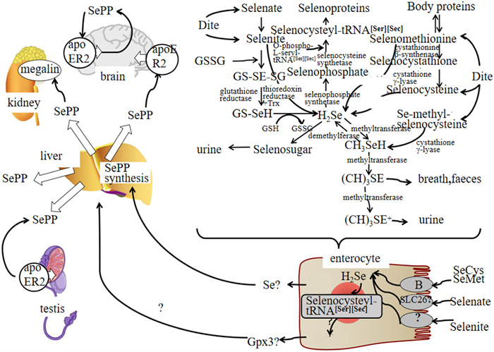 Selenium is a chalcogen element with unique chemical- activities [1-5]. It was discovered by Swedish chemist Jones Jacob Berzerius in 1818 and was initially considered as a toxic element for human beings and livestock for nearly 150 years. It can exist naturally in inorganic forms such as selenite and selenate, or in organic forms such as selenocysteine and selenomethionine. In middle twentieth century, selenium was found to be an essential trace element for health. It widely exists in natural products and can be found in seafood, peas, lentils, legumes, whole grains, organ meats, dairy products, and vegetables [6-9]. Meanwhile, it is also an indispensable element for the body [10, 11]. Selenium participates in biological processes such as biological oxidation, cell differentiation, protein synthesis, and gene transcription, and it exhibits strong antioxidant and immune functions, playing a crucial role in maintaining human health [12]. Selenium deficiency is related to cognitive impairment. In rural areas with low soil selenium content in China, a decrease in physical selenium levels is associated with a decline in cognitive ability [13, 14]. Not only does selenium exist in abundant forms and metabolic systems in human body, but also distribute differently in various organs. Fig. 1 is the "map" of selenium in vivo, and it well clarifies the absorption, metabolism and distribution of selenium in the body [9]. It shows the detailed pathways through which selenium obtained from dietary selenocysteine, selenomethionine, methylselenocysteine, selenite, and selenite. The ingested selenium is absorbed from the intestinal lumen potentially involving transport proteins as indicated. It is then converted into hydrogen selenide (H2Se), and Fig. 1 shows how this intermediate is incorporated into selenoproteins as selenocysteine.