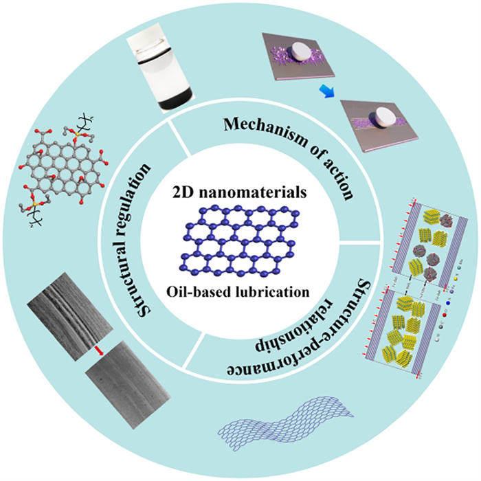 Although 2D nanomaterials show great potential in the field of oil-based lubrication, their implementation in practical engineering applications still faces numerous challenges, particularly their poor dispersion. To address these challenges, researchers are striving to develop more advanced structural regulation strategies and have made significant progress in studying the relationship between chemical structure and lubrication performance. However, a comprehensive review that systematically elucidates the structure-performance relationship between the chemical structure and lubrication properties of 2D nanomaterials, while also providing guidance for their future design, remains lacking. This paper systematically reviews research on 2D nanomaterials in the field of oil-based lubrication (Fig. 1) [74], with a focus on analyzing the structure-performance relationship between their chemical structure and lubrication properties. It also explores the relevant mechanisms and structural regulation strategies while leveraging computational simulations to further uncover their underlying principles. Based on these analyses, this paper summarizes the major challenges and future development directions, aiming to provide a theoretical foundation and practical guidance for the design of high-performance oil-based lubrication materials, while promoting the broader application of 2D nanomaterials in the field of oil-based lubrication.