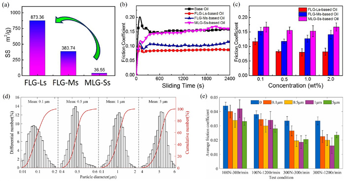 Figure 2.  (a) Specific surface area curve for different additives, (b) friction coefficient versus time curves, and (c) average friction coefficient under different concentration conditions. Reproduced with permission [86]. Copyright 2017, Elsevier. (d) Particle size distribution of h-BN and (e) average friction coefficient under different testing conditions. Reproduced with permission [92]. Copyright 2023, Elsevier.