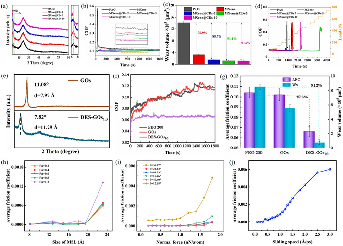 Figure 3  (a) X-ray diffraction pattern for different additives, (b) friction coefficient versus time curve, (c) wear volume, and (d) extreme pressure test. Reproduced with permission [74]. Copyright 2023, Elsevier. (e) X-ray diffraction pattern of GOs and DES-GOs, (f) friction coefficient versus time curve, and (g) average friction coefficient and wear volume. Reproduced with permission [99]. Copyright 2023, Elsevier. Average friction coefficient variation with (h) Moiré size, (i) normal force, and (j) sliding speed. Reproduced with permission [106]. Copyright 2024, Royal Society of Chemistry.