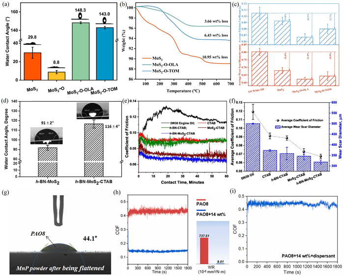Figure 4.  (a) Water contact angle, (b) thermogravimetric analysis curve, and (c) average friction coefficient and wear scar diameter for different additives. Reproduced with permission [39]. Copyright 2023, American Chemical Society. (d) Water contact angle, (e) friction coefficient versus time curve, and (f) average friction coefficient and wear scar diameter for different additives. Reproduced with permission [75]. Copyright 2021, Elsevier. (g) Contact angle of PAO8 on the surface of MnP additive, (h) effect of MnP additive in PAO8 on coefficient of friction and wear rate, and (i) coefficient of friction of MnP additive with dispersant in PAO8. Reproduced with permission [112]. Copyright 2023, Elsevier.