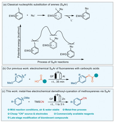 • Figure 1  (a) Nucleophilic substitution of arenes (SNAr reaction). (b) Our previous work on electrochemical SNAr of fluoroarenes with carboxylic acids. (c) Metal-free electrochemical demethoxyl-cyanation of methoxyarenes via SNAr.