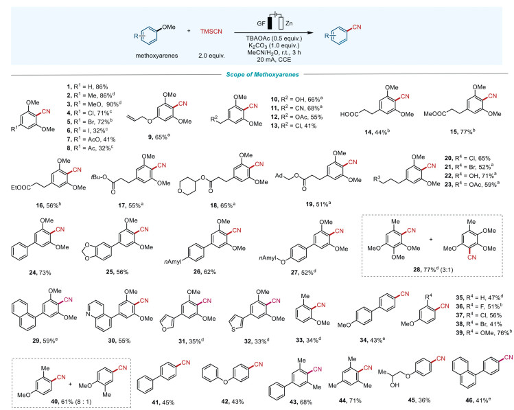 Figure 2  Substrate scope. Reaction conditions: methoxyarenes (0.3 mmol), TMSCN (0.6 mmol), TBAOAc (0.15 mmol), K2CO3 (0.3 mmol), under 20 mA constant current in an undivided cell at room temperature for 3 h with GF as anode and Zn as cathode, MeCN: H2O = 11:1 (v/v), 6 mL. a The reaction was conducted for 1 h. b With 10 mol% Tempo, K2CO3 (3.0 equiv.), 40 ℃, Pt plate as cathode. c With 10 mol% Tempo, K2CO3 (3.0 equiv.), Pt plate as cathode. d 12 mA constant current. e K2CO3 (3.0 equiv.).