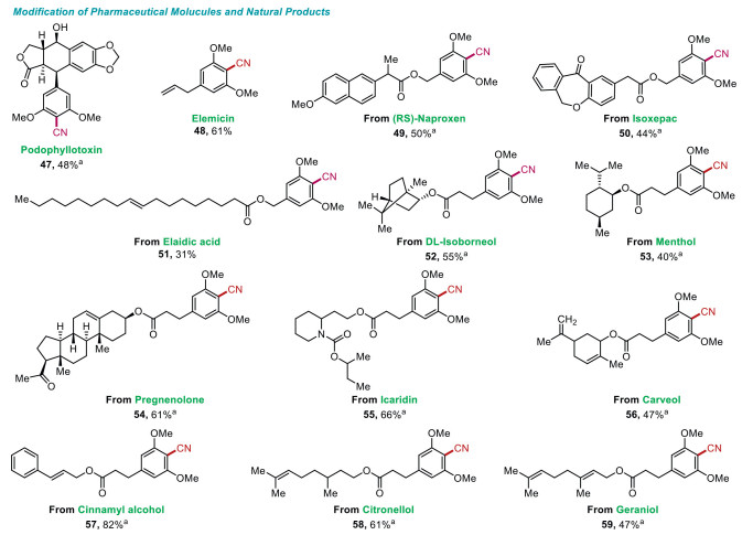 Figure 3.  Late-stage modification. Reaction conditions: methoxyarenes (0.3 mmol), TMSCN (0.6 mmol), TBAOAc (0.15 mmol), K2CO3 (0.3 mmol), under 20 mA constant current in an undivided cell at room temperature for 3 h with GF as anode and Zn as cathode, MeCN: H2O = 11:1 (v/v), 6 mL. a The reaction was conducted for 1 h.