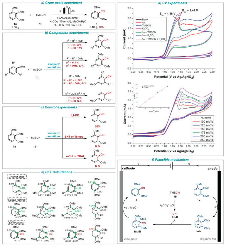 To further explore the reaction mechanism, we conducted cyclic voltammetry (CV) experiments (Fig. 4d). It can be seen that in the scanning window (0 to +2.5 V), no oxidative potential was observed in the background with a 0.1 mol/L TBAPF6 solution in CH3CN (Fig. 4d, black line). Similarly, when TMSCN or K2CO3 was added, no obvious oxidative peak occurred as well (Fig. 4d, blue line and pink line), indicating that TMSCN or K2CO3 couldn't be easily oxidized. However, the CV of 1, 2, 3-trimethoxybenzene (1a) displayed an obvious oxidation signal at 1.41 V vs. Ag/AgNO3 (Fig. 4d, red line), suggesting that 1a undergone electrochemical oxidation at the anode during the reaction. When TMSCN or K2CO3 was added with 1a respectively (Fig. 4d, green line and dark blue line), the oxidation potentials showed no obvious shifts. However, when 1a, TMSCN and K2CO3 were added together (Fig. 4d, purple line), the oxidative potential downshifted by 0.03 V (from 1.41 V to 1.38 V) suggesting that the co-presence of TMSCN and K2CO3 may promote the oxidation process of 1a. Moreover, we performed CV experiments for 1a with variable scan rates. As shown in Fig. 4d, by increasing scan rates, the oxidation signal would occur in a slightly higher potential, and the current would also be increased. To check out the law between the scan rates and the currents, we performed a linear fit analysis. The results demonstrated a strong linear correlation between vscan1/2 and ip for the oxidation of 1a, with a Pearson's R value of 0.9970 and an R2 value of 0.9928, supported that a diffusion control process might be involved in this reaction.