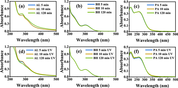 Figure 2  The UV-vis spectrum of solutions containing Fe(Ⅲ) with AL, BH and PA at pH 2.2 in the dark (a-c) and under UV irradiation (d-f), respectively. The Fetot concentration was 100 µmol/L and the PROC concentration was 25 mg/L.