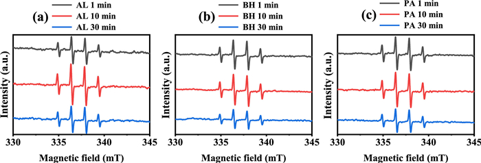Figure 3.  The EPR spectrum of Fe(Ⅲ) complexes with (a) AL, (b) BH and (c) PA at pH 2.2 under UV irradiation. The Fetot concentration was 100 µmol/L and the PROC concentration was 25 mg/L.