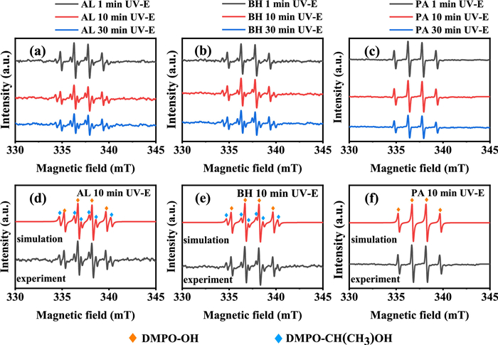 Figure 4.  The EPR spectrum of Fe(Ⅲ)-PROC complexes using ethanol (E) as a scavenger at pH 2.2 under UV irradiation. (a–c) are experimental data, and (d–f) are simulated data. The Fetot concentration was 100 µmol/L and the PROC concentration was 25 mg/L. Ethanol concentration was 0.5 mol/L.