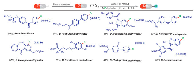 In the field of photocatalysis, arylthianthrene salts have attracted widespread attention due to their importance in synthetic chemistry and materials science [4]. However, traditional catalytic methods typically rely on external electron donors to activate their reactions [5]. To address this limitation, Yu and coworkers propose an innovative energy transfer (EnT) strategy, combined with a metal-free photocatalyst, 2,3,4,5,6-penta-(9H-carbazole-9-yl)benzonitrile (5CzBN), to efficiently activate arylthianthrene salts [5]. Under visible light irradiation, this work cleverly utilized CDCl3 as a deuterium source, successfully achieving the C–H deuteration of aromatic compounds and synthesizing various deuterated aromatic compounds (Scheme 1). Compared to the known photocatalytic deuteration methods using organic solvents, the present strategy uses water with high bond dissociation energy as the solvent, which not only obtains excellent reaction results but also effectively reduces the pollution to the environment. It is worth mentioning that the present strategy exhibits a very excellent level of deuteration. This process not only demonstrated the efficient and selective introduction of deuterium atoms but also provided a novel approach for the modification of natural products and pharmaceutical molecules. In addition, the study successfully achieved the late-stage modification of various complex drugs, including the lipid-lowering drug fenofibrate (Tricor) and the attention deficit hyperactivity disorder (ADHD) drug (R)-Tomoxetine, demonstrating the broad application potential of this method. This not only advances the development of medicinal chemistry but also provides crucial technical support for the development of new drugs.