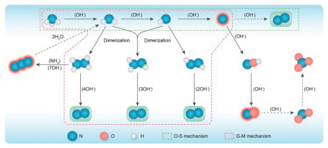 Research on the AOR of Pt-based metals can be traced back to 1905, when it was first found that Pt could catalyze the oxidation of ammonia to generate nitrogen in an alkaline solution [23]. Over the years, as the understanding of catalysts and reactors has advanced, Pt-based alkaline ammonia fuel cells with Pt-based catalysts serving as anodes have gradually developed. The reaction mechanism of the AOR increased significantly over time. In 1963, Oswin and Salomon proposed a detailed mechanism for the stepwise dehydrogenation of ammonia, known as the Oswin-Salomon (O-S) mechanism [24]. According to their findings, the reaction begins with the adsorption of *NH3 molecules on the catalyst surface. This is followed by sequential dehydrogenation to form *NH2, *NH, and *N intermediates. This process culminates with the coupling of two *N intermediates to form N2 molecules, which then desorb from the catalyst surface (Fig. 3). A few years later, the O-S mechanism was further refined by Gerischer and Mauerer in 1970 [25]. They proposed modifications to the initial dehydrogenation steps, suggesting that coupling between *NHx and *NHy intermediates occurs, forming an *N2Hx+y complex. This complex then undergoes further dehydrogenation before finally desorbing to N2. This adjustment provided deeper insight into the complex interactions and transformations occurring during the ammonia oxidation process. A significant further advancement occurred in 2006 when Pérez et al. utilized surface-enhanced Raman spectroscopy (SERS) to analyze the reaction and identified the N3- intermediate in the reaction process, marking a crucial development in the understanding of the reaction mechanism for AOR [26]. This discovery not only substantiated earlier theoretical models but also expanded the knowledge of the intermediate species involved, contributing to a more comprehensive understanding of the electrocatalytic AOR.