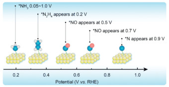 Since the beginning of the 21st century, the development of various spectroscopic techniques has led to the identification of additional intermediate species involved in the electrocatalytic oxidation of ammonia. As illustrated in Fig. 4, these advancements have enabled researchers to observe the differences in intermediate species formed at various electrode potentials. In 2015, Matsui et al. obtained adsorption signals for *NH3 molecules in the potential range of 0.05 V-1 VRHE, adsorption signals for *N2H4 were obtained at 0.2 and 0.4 VRHE, and an adsorption signal for *NO was obtained at 0.5 VRHE [27]. In 2016, Katayama et al. observed a signal for *NO at 0.7 VRHE. Although the pathway of ammonia oxidation has become increasingly clear with the identification of intermediates one by one, progress in the development of AOR has been hindered [28]. The primary challenges identified include: (1) Catalyst deactivation. Differential electrochemical mass spectrometry (DEMS) and SERS have shown that during the first step of the reaction, *NH3 is adsorbed onto the active sites of the catalyst. After complete dehydrogenation, the resulting single *N species may fail to couple with another *N species to form N2. Instead, this *N species remains bound to the active site, effectively blocking it and leading to catalyst deactivation [29]. Additionally, at higher potentials, the presence of *NOx species has been detected. These species also contribute to the deactivation of the catalyst. The formation of *NOx not only occupies active sites but also may lead to degradation or poisoning of the catalyst, further diminishing its effectiveness and durability [30]; (2) High overpotential. Currently, even the most active catalyst, the PtIr alloy, has an overpotential exceeding 400 mV. This high overpotential results in a lower output voltage and reduced power for fuel cells that utilize the AOR at the anode and the ORR at the cathode. Such inefficiencies significantly hamper the practical application and scalability of these fuel cells in real-world settings [31].