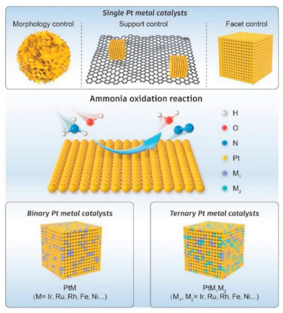 The development of Pt-based catalysts for ammonia oxidation has a long history since 1905, when the catalytic production of N2 on the surface of Pt was first observed [23]. However, early development of these catalysts was hampered by the limited capabilities of characterization technologies, making it challenging to understand the molecular level phenomena that cause poisoning in Pt as an ammonia oxidation catalyst. In the 21st century, with significant improvements in characterization and synthetic methods, researchers now have the ability to characterize and synthesize catalysts at the molecular and atomic levels. As a result, despite being a traditional choice, Pt remains the most promising material for ammonia oxidation applications [3]. The design and development of Pt-based catalysts have evolved from monometallic Pt to multimetallic Pt alloys. Innovations in the selective exposure of facets, the engineering of different sizes or morphologies, and modifications in support structures have led to the emergence of a number of high performance catalysts. These advancements reflect a sophisticated understanding of catalyst architecture and its impact on activity and durability, paving the way for more effective and robust applications in ammonia oxidation (Fig. 5).