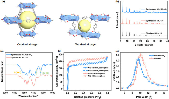 Figure 1  (a) Representation of octahedral cage (12.0 Å) and tetrahedral cage (6.0 Å) in MIL-125. (b) PXRD patterns of synthesized MIL-125, MIL-125-NH2, and simulated MIL-125. (c) FTIR spectra of MIL-125 and MIL-125-NH2. (d) The N2 adsorption-desorption isotherms measured at 77 K and (e) pore size distribution of MIL-125 and MIL-125-NH2.