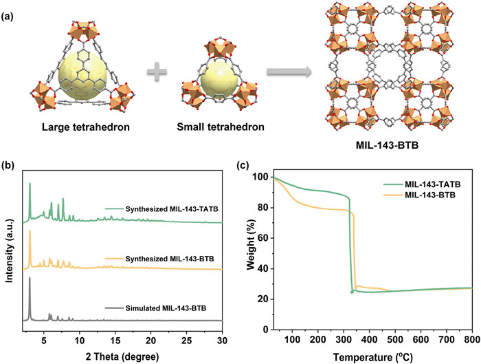 Figure 2.  (a) Representation of large tetrahedron (11.0 Å) and small tetrahedron (9.0 Å) in MIL-143-BTB. (b) PXRD patterns of synthesized MIL-143-BTB, MIL-143-TATB, and simulated MIL-143-BTB. The patterns were collected at BL17B1 beamline, Shanghai Synchrotron Radiation Facility (SSRF) (λ = 1.24 Å). (c) TGA plots of MIL-143-BTB and MIL-143-TATB. Experiment condition: temperature ramp from room temperature to 800 ℃ at 10 ℃/min under the oxygen atmosphere.
