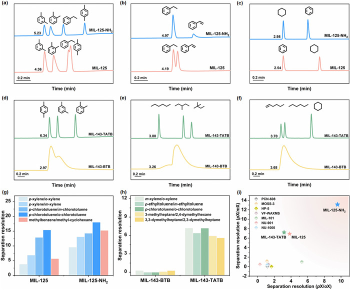 Figure 3  Gas chromatogram on MIL-125 and MIL-125-NH2 coated capillary columns at the N2 flow of 0.5 mL/min for the separation of (a) xylene isomers, (b) styrene/ethylbenzene, and (c) benzene/cyclohexane. Gas chromatogram on MIL-143-BTB and MIL-143-TATB coated capillary columns at the N2 flow of 0.5 mL/min for the separation of (d) xylene isomers, (e) C6H14 isomers, and (f) the mixture of 1-hexene, n-hexane, and cyclohexane. The numbers on the left represented the starting time of the elution of the first chromatographic peaks. Comparison of separation resolution on (g) MIL-125 and MIL-125-NH2 coated columns and (h) MIL-143-BTB and MIL-143-TATB coated columns. (i) Comparison of the separation resolution of pX/oX and pX/mX on different stationary phases.
