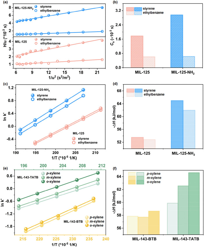 Figure 4  (a) The Golay plots of styrene and ethylbenzene on MIL-125 and MIL-125-NH2 coated columns at 503.15 K. (b) The calculated Cs constants of styrene and ethylbenzene on MIL-125 and MIL-125-NH2 coated columns. (c) The van't Hoff plots of styrene and ethylbenzene on MIL-125 and MIL-125-NH2 coated columns. (d) The calculated ΔH values of styrene and ethylbenzene on MIL-125 and MIL-125-NH2 coated columns. (e) The van't Hoff plots of xylene isomers on MIL-143-BTB and MIL-143-TATB coated columns. (f) The calculated ΔH values of xylene isomers on MIL-143-BTB and MIL-143-TATB coated columns.