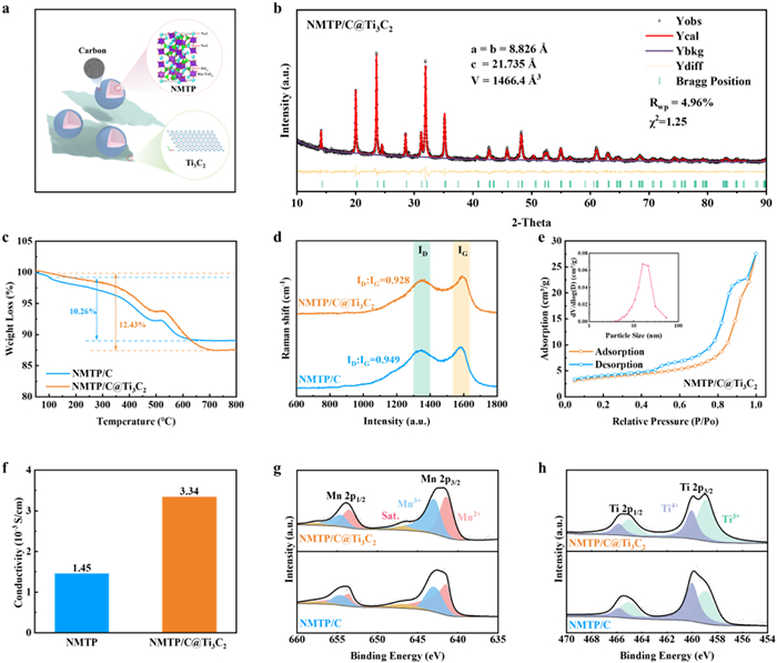 • Figure 1  (a) Schematic diagram and (b) the Rietveld refinements of the XRD patterns of NMTP/C@Ti3C2 material. (c) TGA curves and (d) Raman spectra of NMTP and NMTP/C@Ti3C2. (e) The BET test results of NMTP/C@Ti3C2. (f) Electric conductivity of the NMTP and NMTP/C@Ti3C2. High-resolution (g) Mn 2p and (h) Ti 2p XPS spectra of NMTP/C and NMTP/C@Ti3C2.