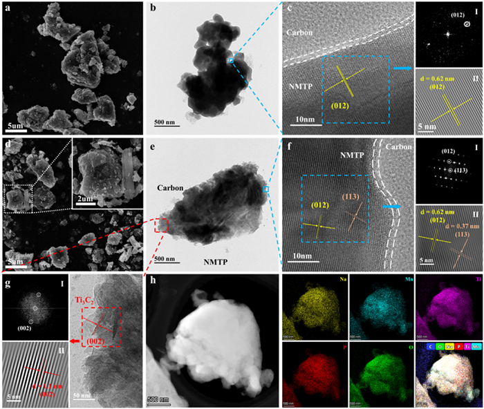 Figure 2  (a) SEM, (b) TEM, (c) HRTEM images and FFT pattern of NMTP/C material. (d) SEM, (e) TEM, (f, g) HRTEM images and FFT pattern. (h) HAADF-STEM image and the corresponding elemental mappings of NMTP/C@Ti3C2 material.