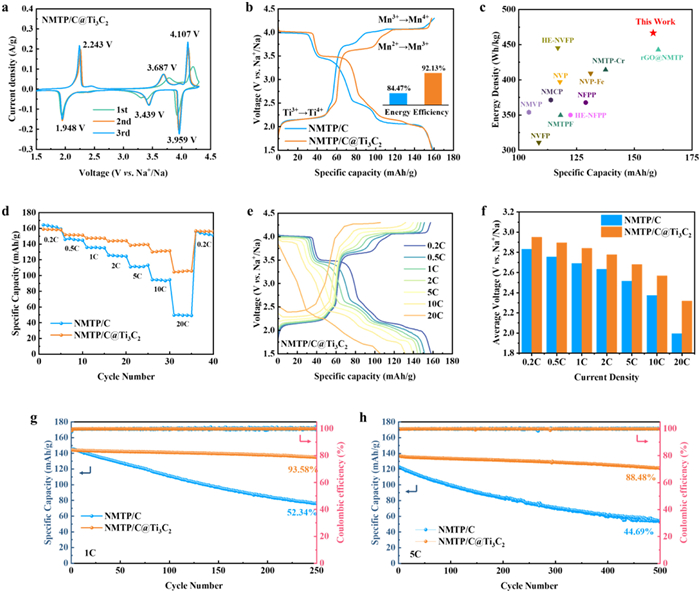 Figure 3.  (a) CV curves of NMTP/C@Ti3C2 at 0.1 mV/s. (b) GCD curves of NMTP/C and NMTP/C@Ti3C2 at 0.2 C. (c) Comparison of the NMTP/C@Ti3C2 with other reported NASICON-type SIBs. (d) Rate performance of NMTP/C and NMTP/C@Ti3C2. (e) GCD curves of NMTP/C@Ti3C2 at different current densities. (f) The average discharge voltage of NMTP/C and NMTP/C@Ti3C2 at different rates. Cycling performance of NMTP/C and NMTP/C@Ti3C2 at (g) 1 C and (h) 5 C.