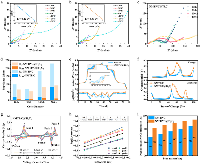 Figure 4  Nyquist plots at different temperatures and Arrhenius plots of (a) NMTP/C and (b) NMTP/C@Ti3C2. (c) The Nyquist plots and (d) the impedance change of NMTP/C@Ti3C2 at different cycling numbers. (e) GITT curves and Na+ diffusion coefficient and (f) overpotential of NMTP/C and NMTP/C@Ti3C2 cathodes. (g) CV curves of NMTP/C@Ti3C2 obtained at different scan rates of 0.1, 0.2, 0.3, 0.4, and 0.5 mV/s. (h) The log(i) versus log(v) plots of NMTP/C@Ti3C2 at different redox states. (i) Capacitance contribution of NMTP/C and NMTP/C@Ti3C2.