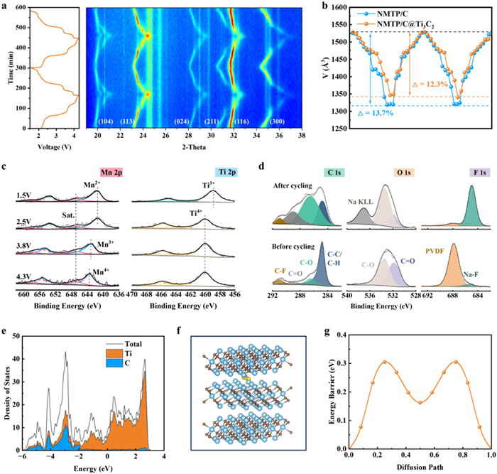 Figure 5.  (a) In-situ XRD patterns of NMTP/C@Ti3C2 cathode during the charge/discharge process. (b) The volume variation of the unit cell of NMTP/C and NMTP/C@Ti3C2 cathodes during the charge/discharge process. (c) Mn 2p and Ti 2p XPS spectrum of NMTP/C@Ti3C2 under different voltages. (d) C 1s, O 1s and F 1s XPS spectrum of NMTP/C@Ti3C2 cathode before and after cycling. (e) Density of states of Ti3C2-MXene. (f) Schematic diagram of sodium ion diffusion between Ti3C2-MXene layers. (g) Energy barrier of sodium ion diffusion between Ti3C2-MXene layers.