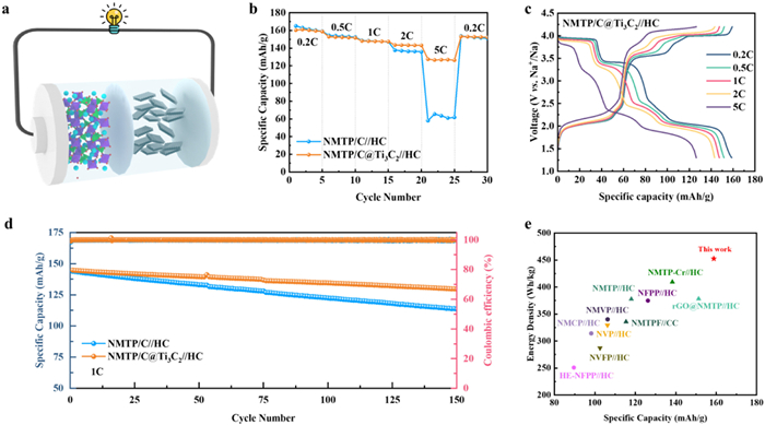 Figure 6.  (a) Schematic diagram of the full cell. (b) Rate performance of NMTP/C//HC and NMTP/C@Ti3C2//HC. (c) The GCD curves of NMTP/C@Ti3C2//HC at different current density. (d) Cycling performance of NMTP/C//HC and NMTP/C@Ti3C2//HC at 1 C. (e) Comparison of the NMTP/C@Ti3C2//HC full cell with other reported NASICON-type SIBs.