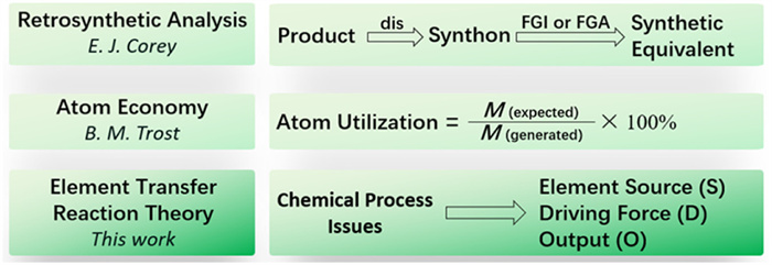 However, in chemical industrial process, the influencing factors are constantly changing. Particularly in the production of low value-added products, relying solely on the aforementioned two theories is insufficient to select the most optimal solution. Besides reaction steps and atom economy, significant indicators involved in choosing a chemical process route also encompass raw material cost, the availability and substitutability of raw materials, the stability of the industrial chain, reaction energy consumption, environmental matters, etc. The competition in the field of modern industrial synthesis is intense, and the requirements are becoming increasingly elevated. These demands breaking with conventions, acquiring distinctive techniques, and achieving technological overtaking on curves. Hence, a new systematic theory is requisite to guide the design of chemical processes. In 2020, we proposed the Element Transfer Reaction (ETR) theory, which is an important fundamental theory guiding chemical process design [3, 4]. This theory approaches problems from the perspective of element circulation. It simplifies the complexity and decomposes the core issues of chemical processes into three indexes: element source (S), driving force (D), and output (O) (Fig. 1). Under the guidance of this theory, we have achieved a series of accomplishments in the industry. This paper aims to further elucidate the scientific connotation of the theory and discuss its application prospects.